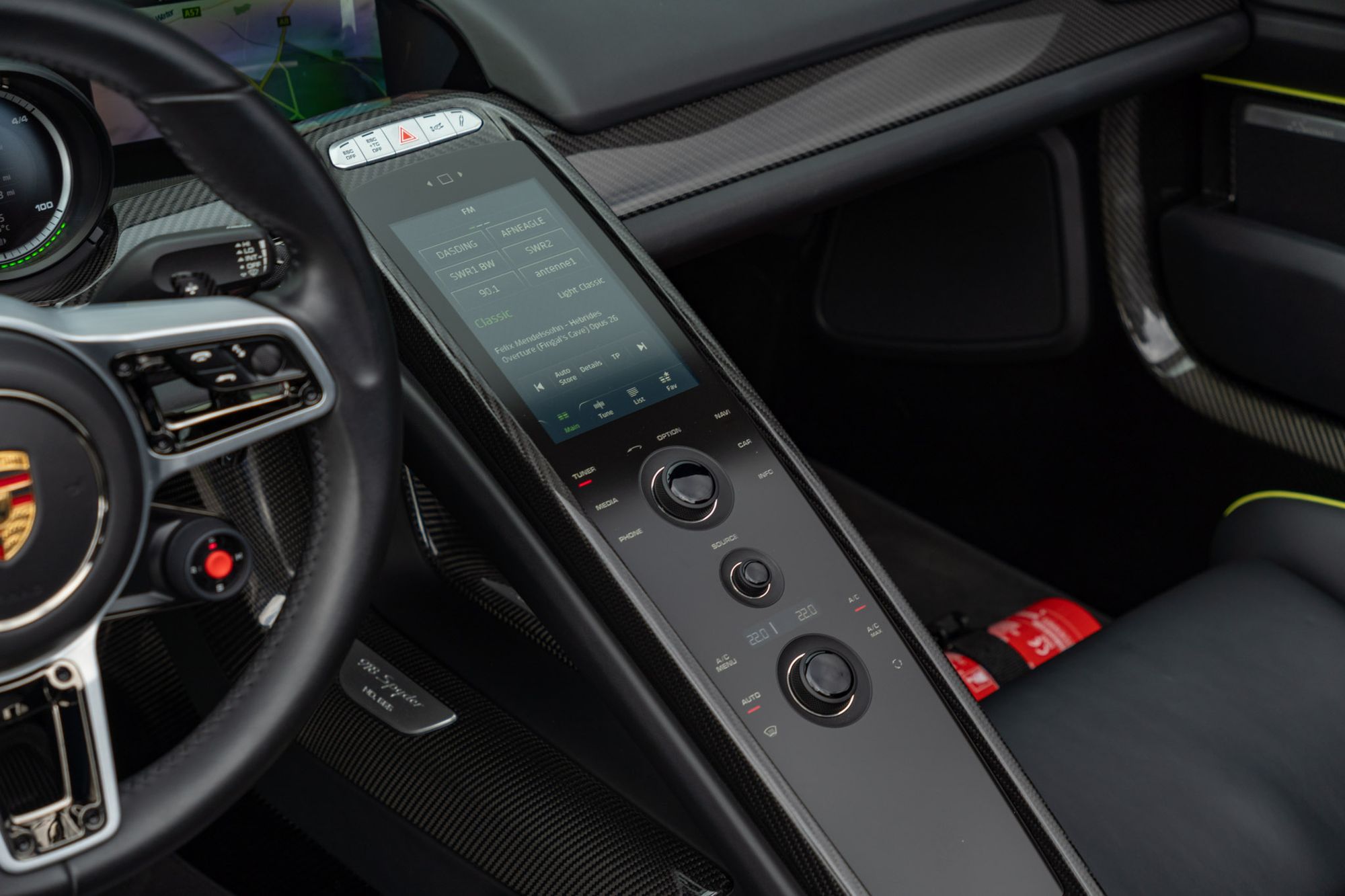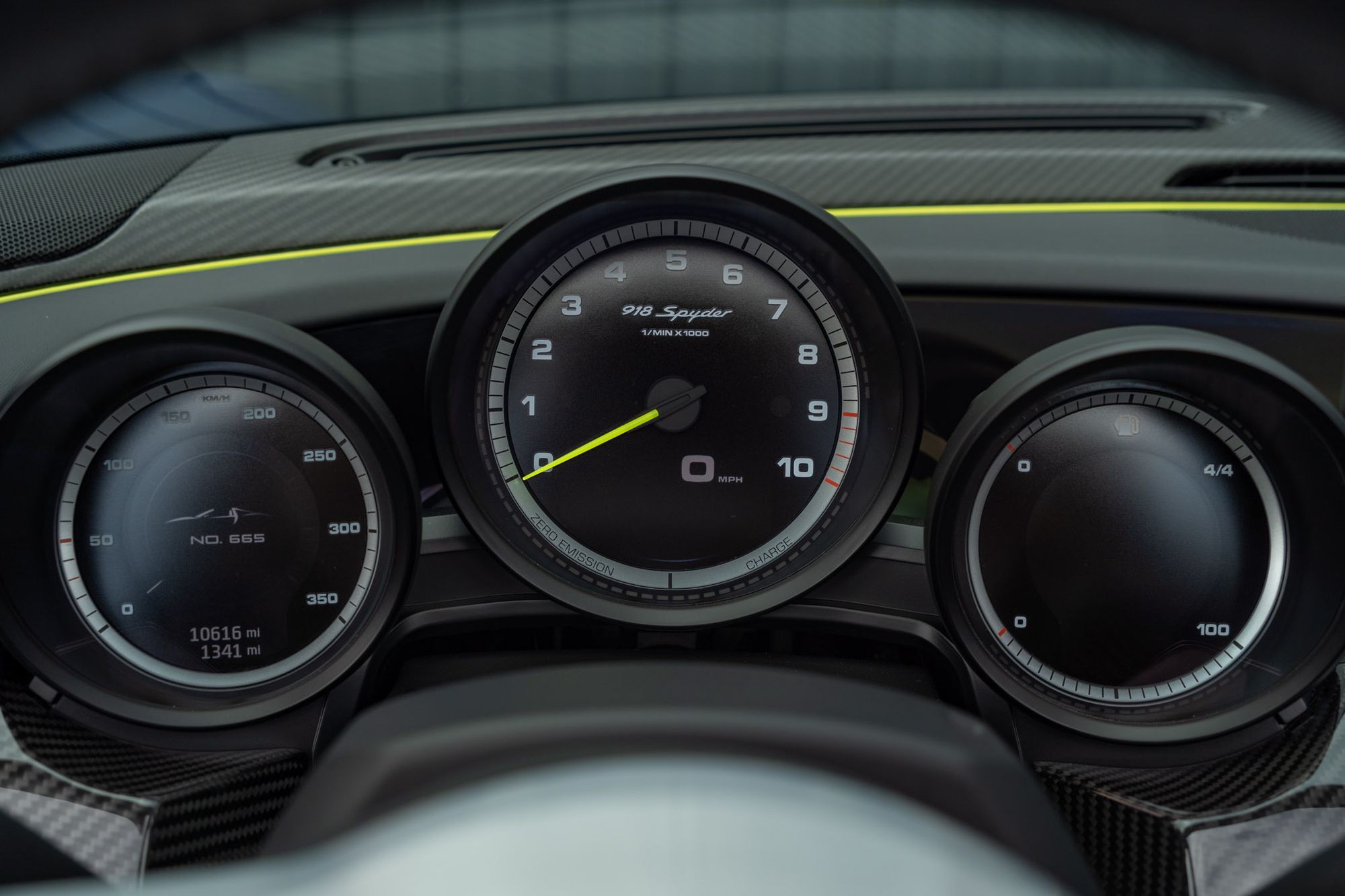 The 918 Spyder offers several different running modes, including E-Drive, which allows the car to run under battery power alone using the rear electric motor and front motor, giving a claimed range of 12 miles. Under the E-Drive mode the car can attain a maximum speed of 93 mph. Two hybrid modes, Hybrid and Race, use both the engine and electric motors to provide the desired levels of economy and performance. In Race mode, a push-to-pass button initiates the Hot Lap setting, which delivers additional electrical power.