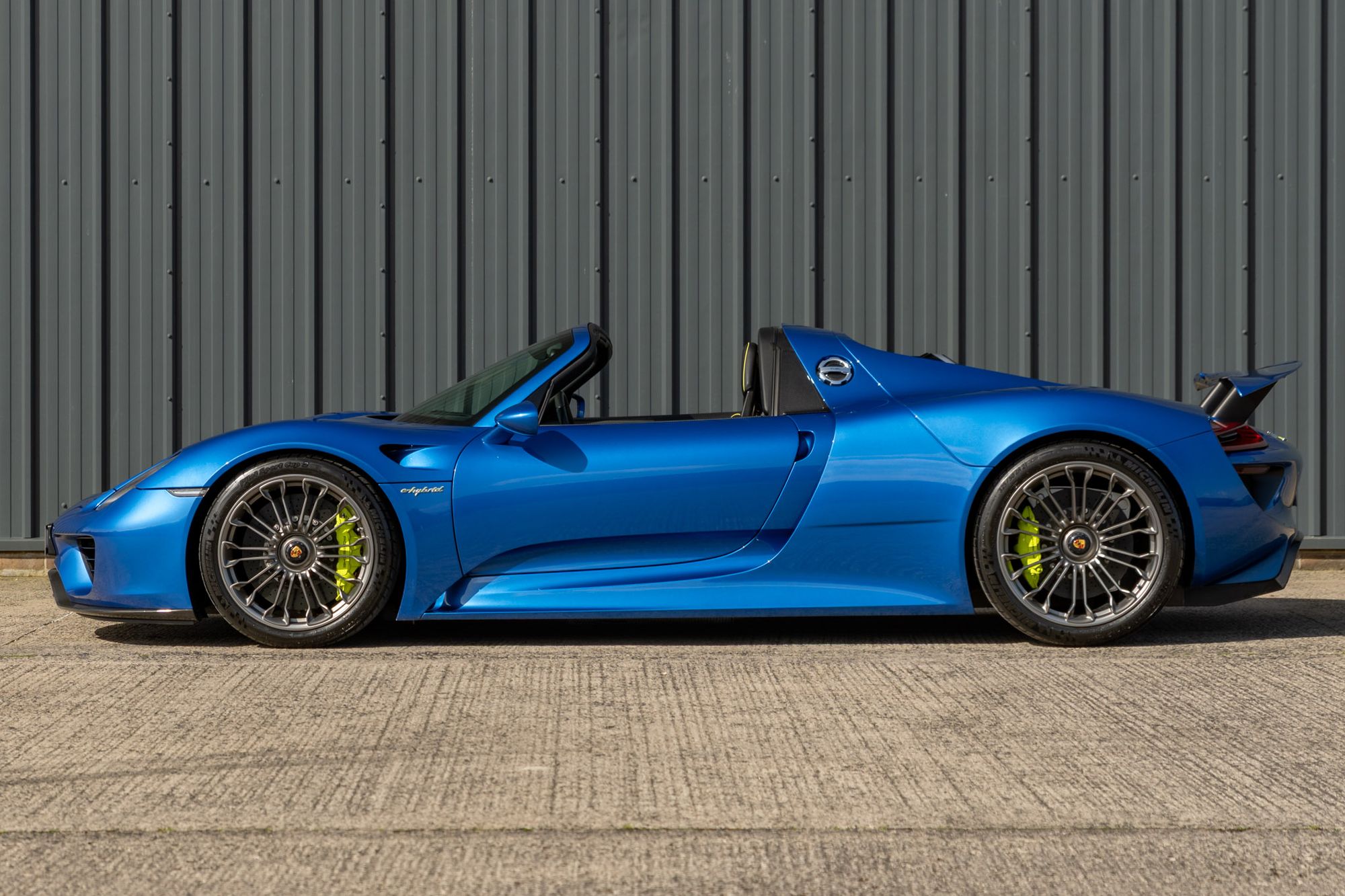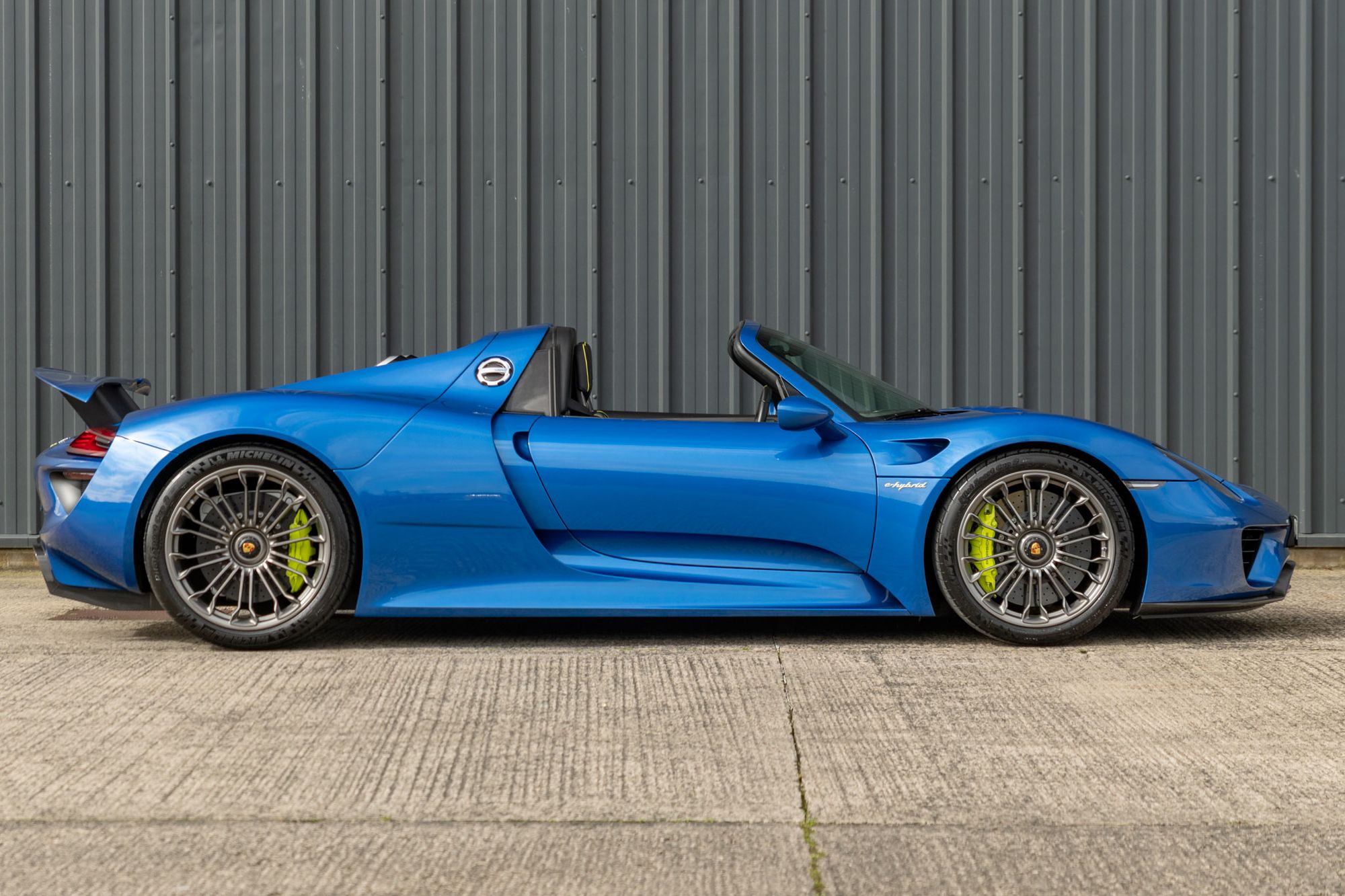 The Porsche 918 Spyder is a limited-production plug-in hybrid sports car, of which only 918 examples were built. It is powered by a mid-mounted naturally aspirated 4.6-litre V8 derived from the RS Spyder Le Mans Prototype, developing 599hp and 398lb ft of torque, with two electric motors delivering an additional 282hp. One 154hp electric motor drives the rear wheels in parallel with the engine and also serves as the main generator, delivering power to the rear axle via a seven-speed PDK gearbox, while the front 127hp electric motor directly drives the front axle, and an electric clutch decouples the motor when not in use. The system delivers 875hp and 944 lb-ft of torque in total, resulting in a claimed 0-62mph sprint time of just 2.6 seconds, and a top speed of 214mph. Independent media tests found it was even quicker, with Car and Driver magazine recording a 0-60mph time of just 2.2 seconds.